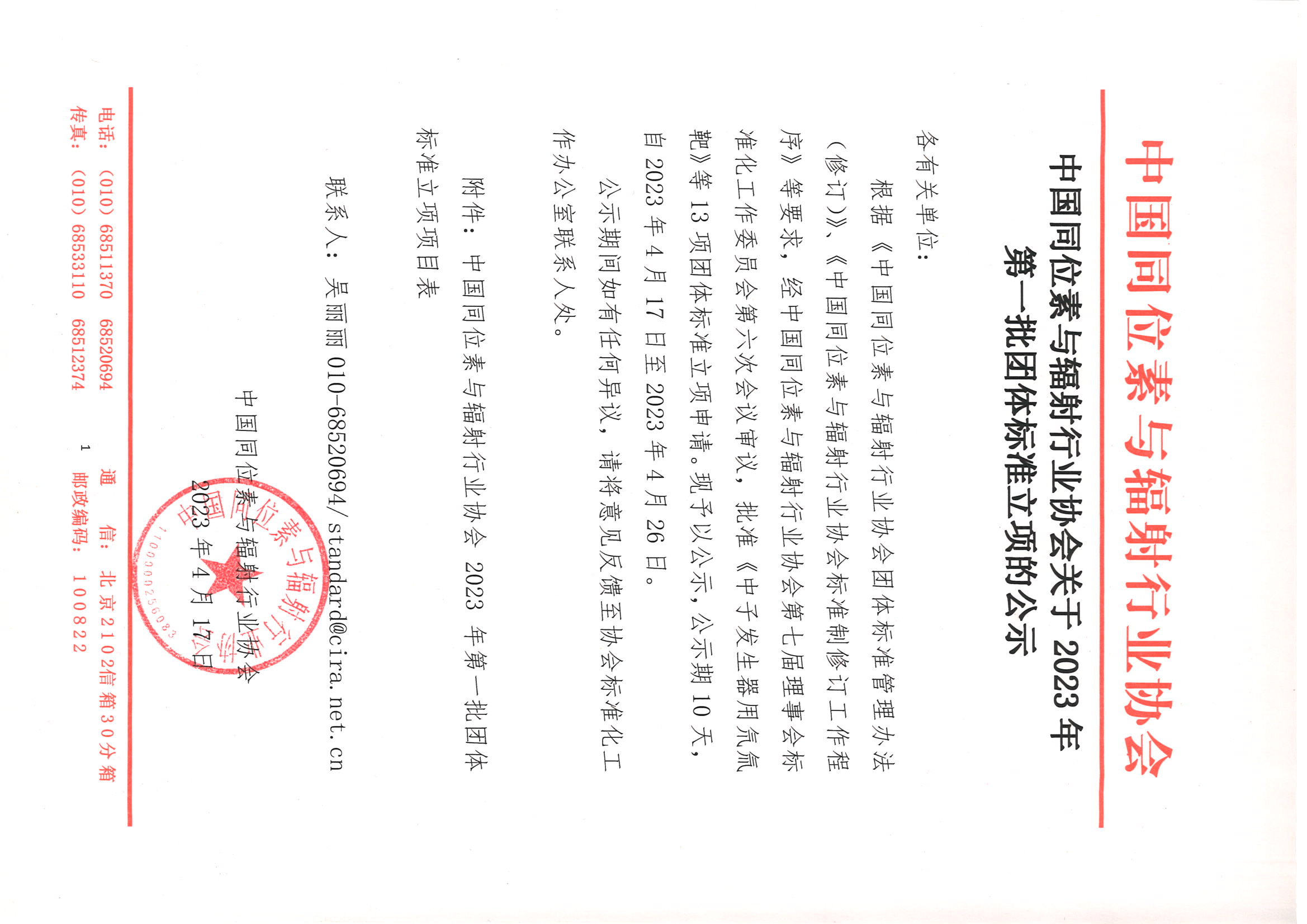 中国同位素与辐射行业协会关于2023年第一批团体标准立项的公示