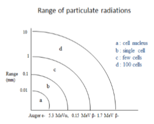 对于内部治疗,高强度线性能量转移(LET)的放射治疗是有效的。所以,放射性核素如β-、α或电子发射粒子辐射, 半衰期为几天且化学性质合适的放射性核素适用于治疗性核医学;左图显示了组织中不同粒子的射程,该图给出了根据目标组织大小选择合适的放射性核素的重要性的想法。