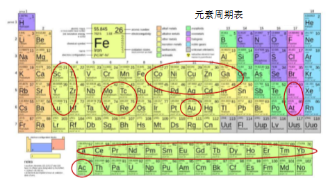 前面列出的最广泛使用的放射性同位素,可以想像成元素周期表中的簇,如图所示。
