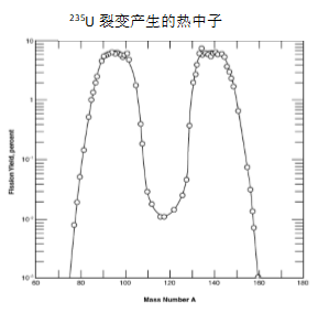 医疗卫生中使用的许多放射性同位素是在研究反应堆中生产的,并且通常使用(n,γ)或(n,γ)→β→反应。但是,235U的裂变产生了各种不同产率的放射性同位素,在质量数100和130左右达到峰值,如下图所示,这是生产99m Tc和其他一些放射性同位素(如131I、133Xe)的途径。
