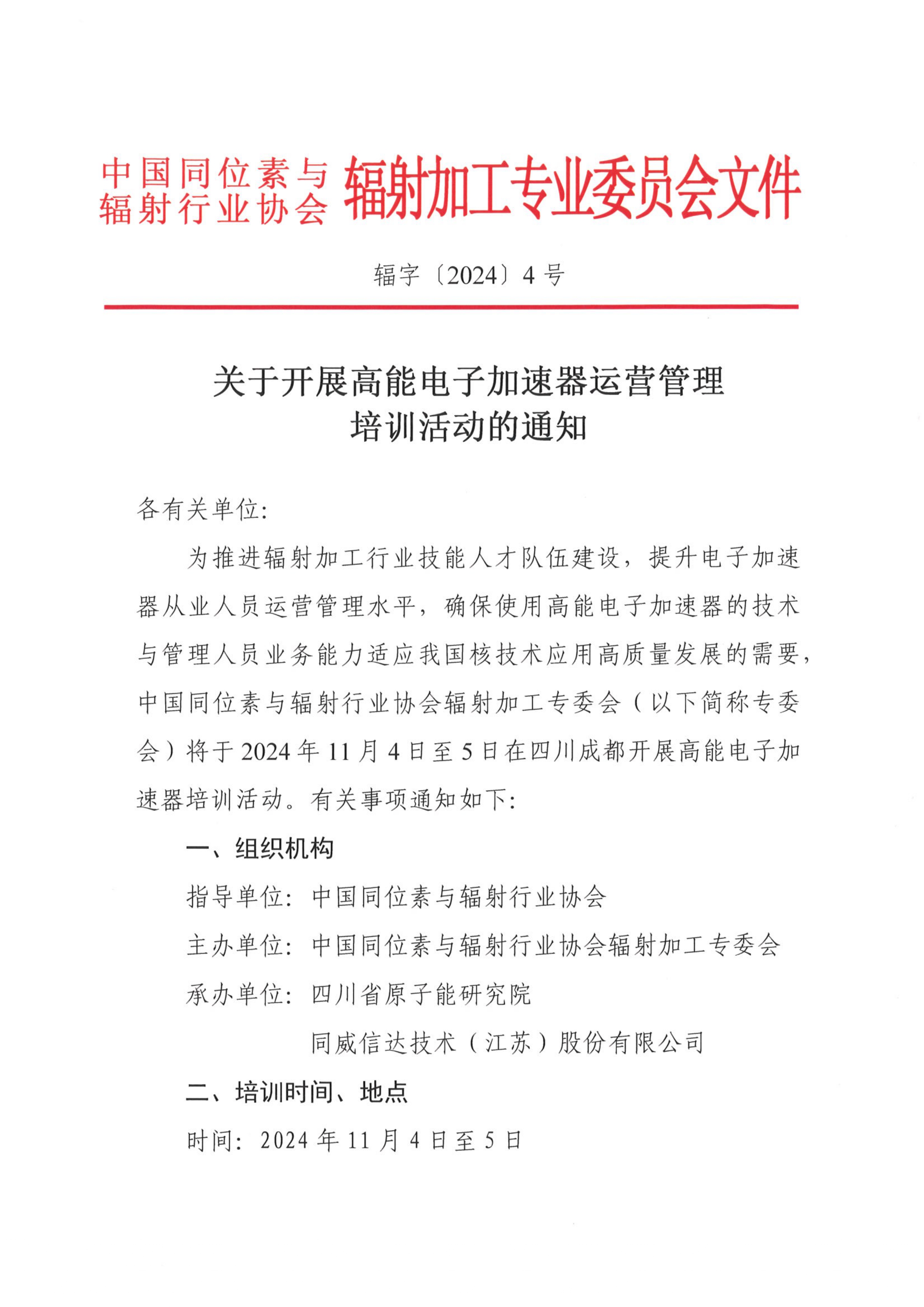 附件下载:中国同位素与辐射行业协会辐射加工专委会关于开展高能电子加速器运营管理培训活动的通知.pdf