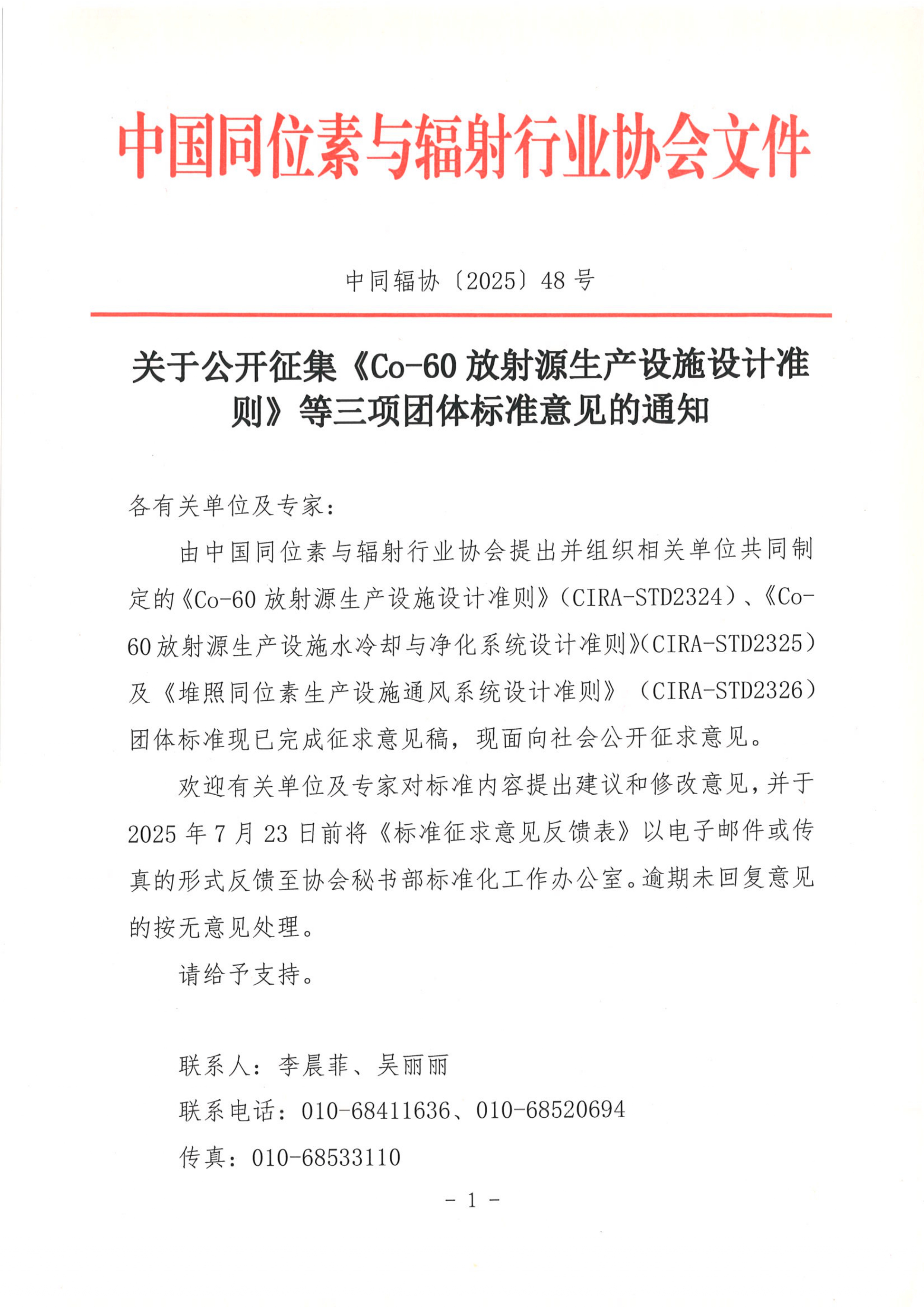 中同辐协〔2025〕48号 关于公开征集《Co-60放射源生产设施设计准则》等三项团体标准意见的通知.PDF