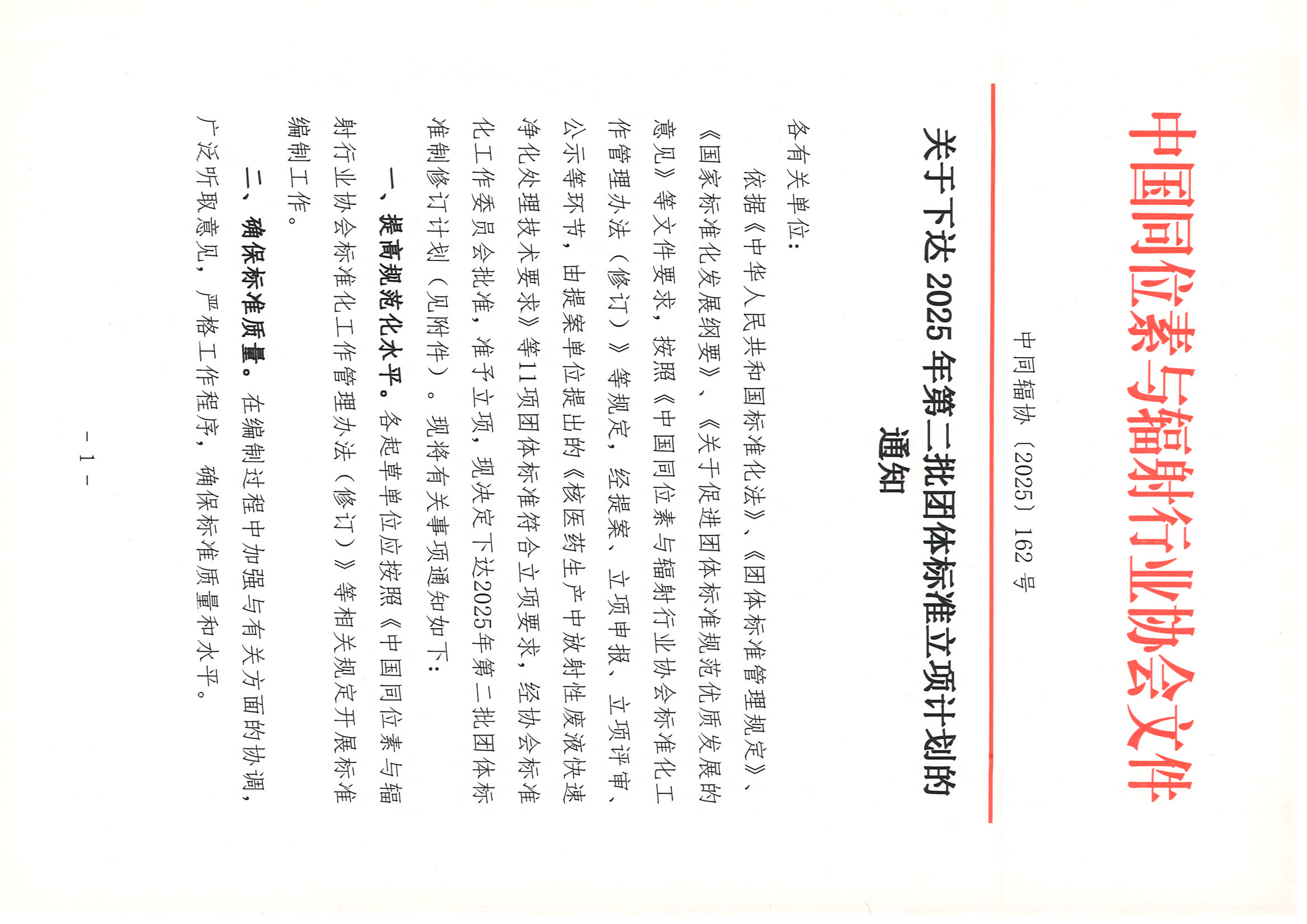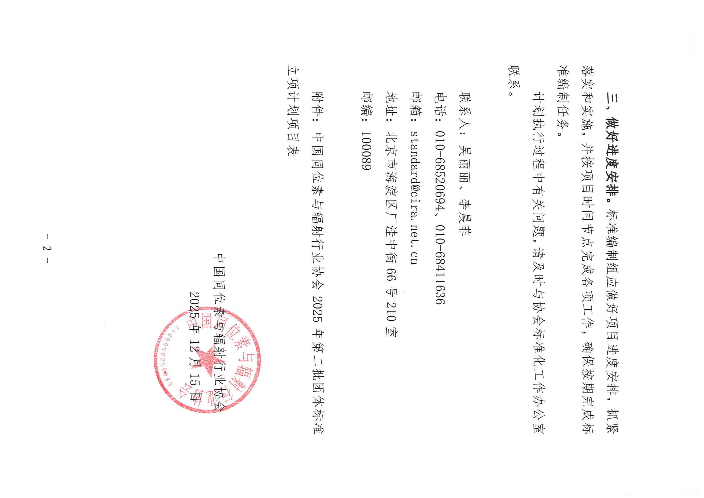 通知电子版及附件下载:中国同位素与辐射行业协会关于下达2025年第二批团体标准立项计划的通知.PDF