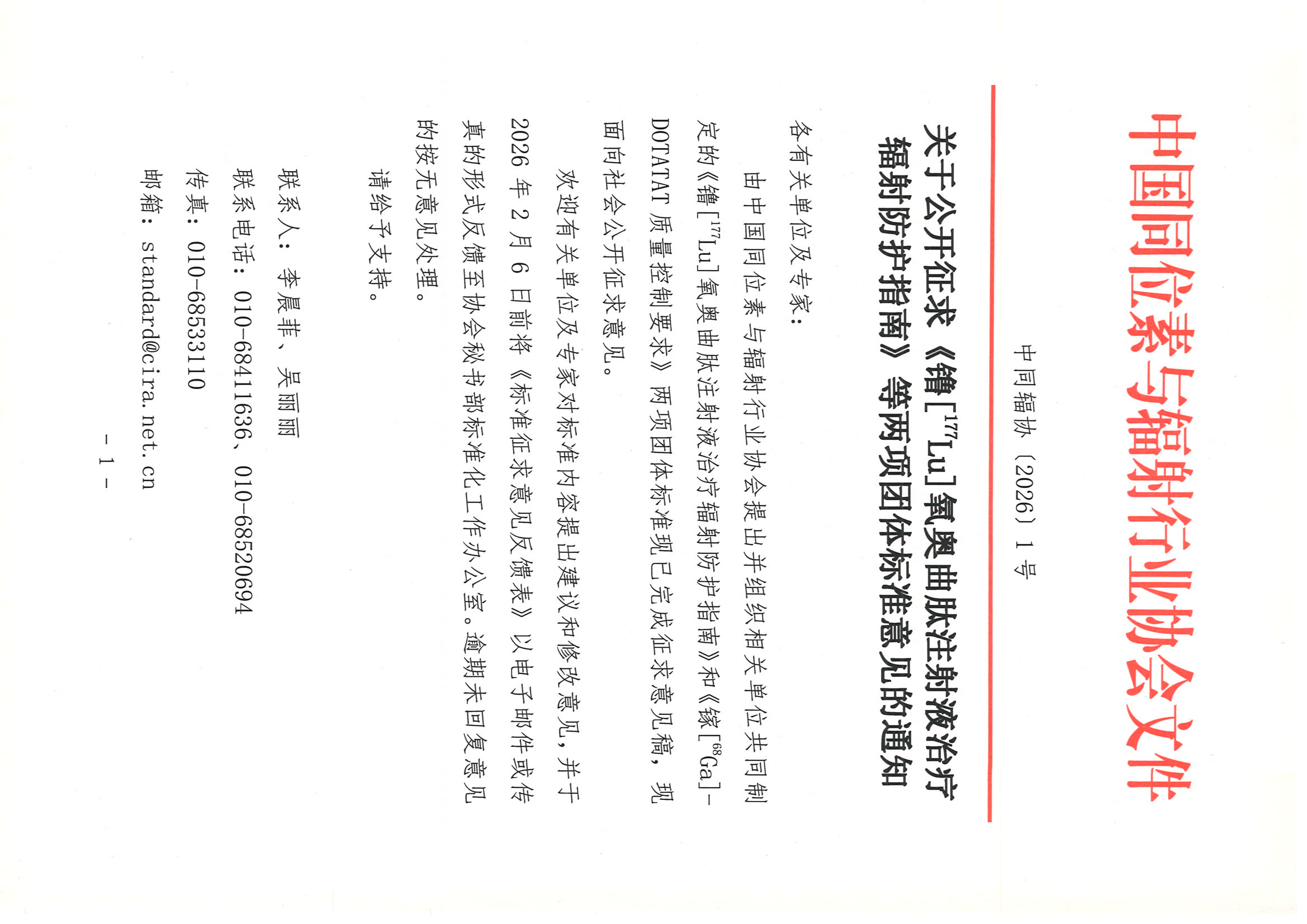 中同辐协〔2026〕1号 关于公开征求《镥[177Lu]氧奥曲肽注射液治疗辐射防护指南》等两项团体标准意见的通知.PDF