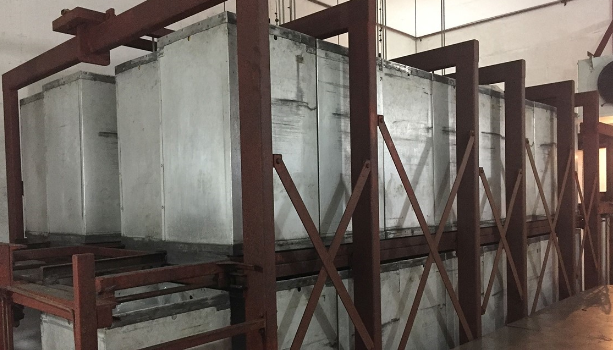 装满食品的金属箱在等着用γ射线辐照。(照片:E.Marais/IAEA)