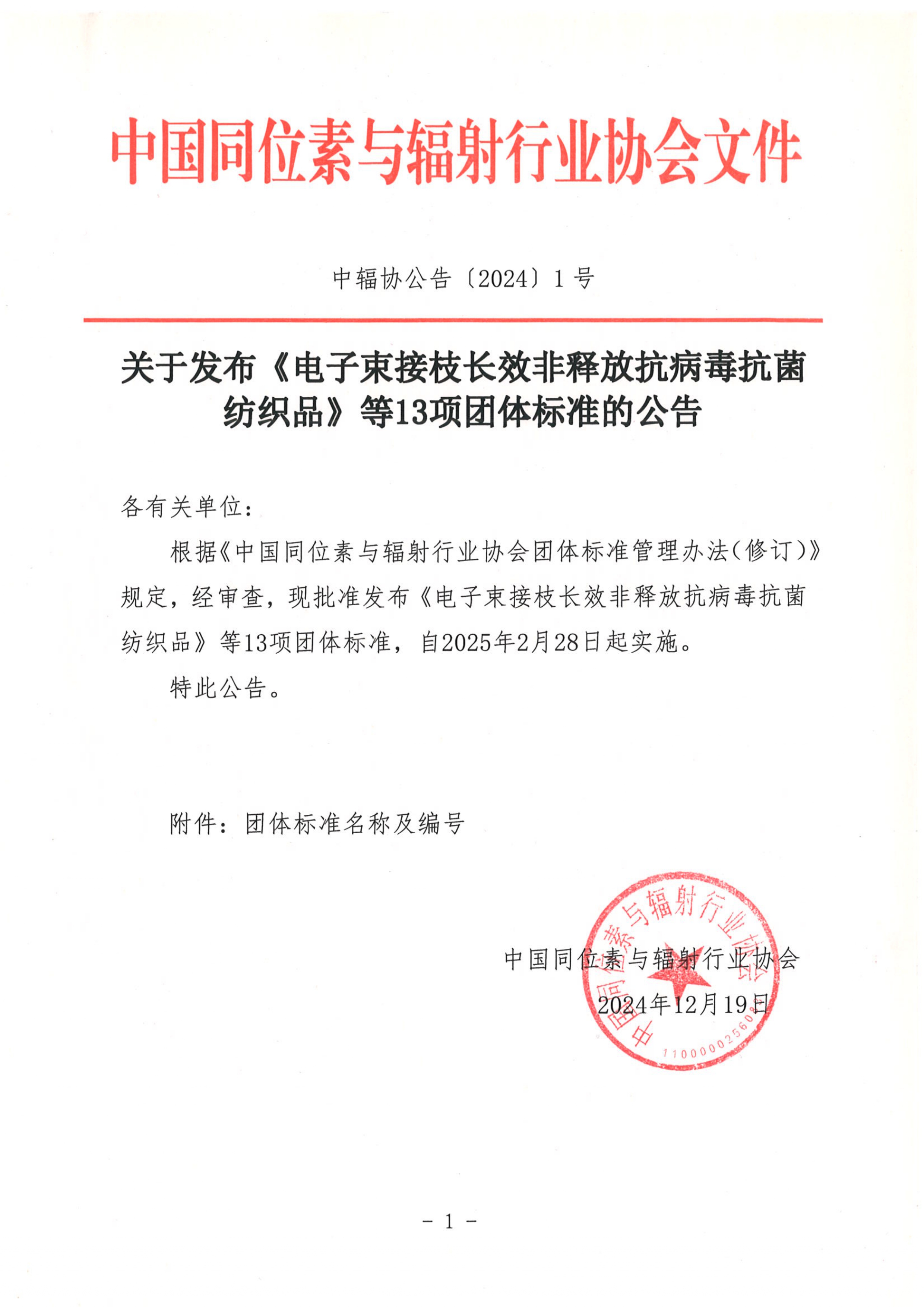 附件下载:中国同位素与辐射行业协会关于发布《电子束接枝长效非释放抗病毒抗菌纺织品》等13项团体标准的公告.pdf