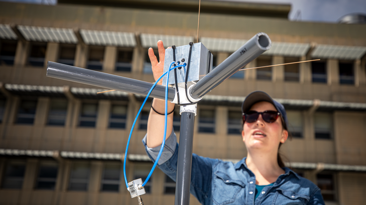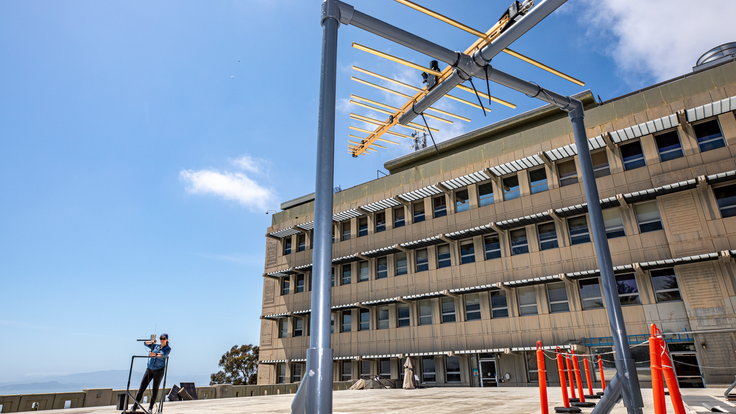 研究团队带着一个从 3 米缩小到 30 厘米的天线比例模型,到伯克利实验室一座大楼的屋顶,用发射器将信号穿过宽阔的空间发送到天线上。
