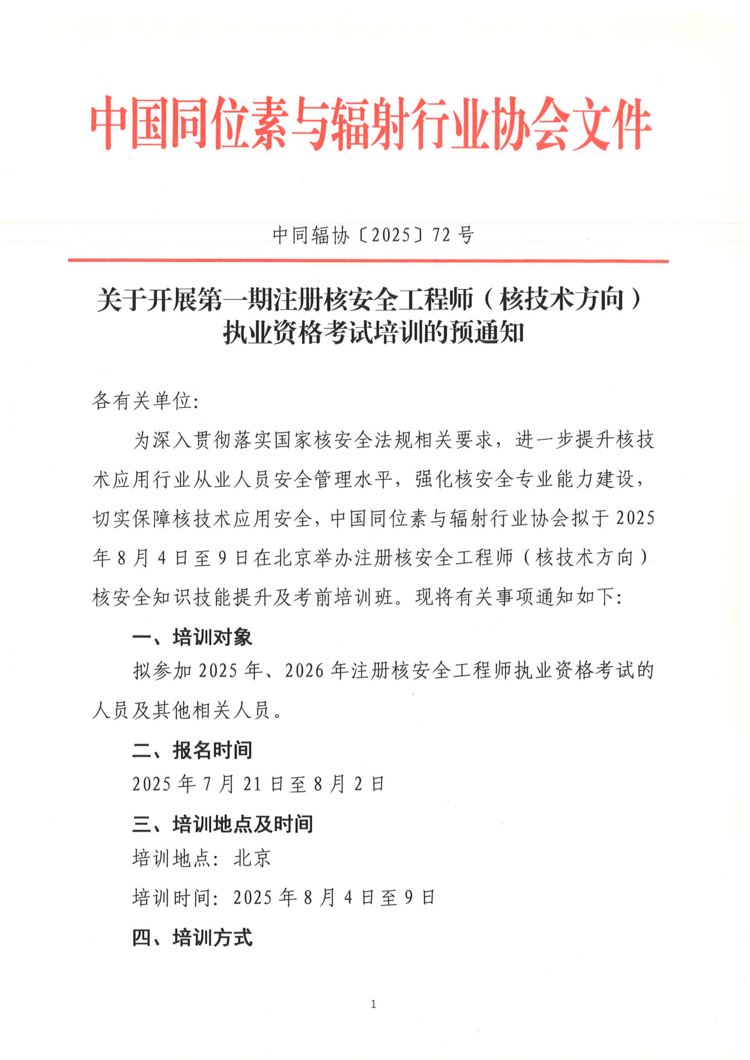 通知电子版下载:关于开展第一期注册核安全工程师(核技术方向)执业资格考试培训的预通知.PDF