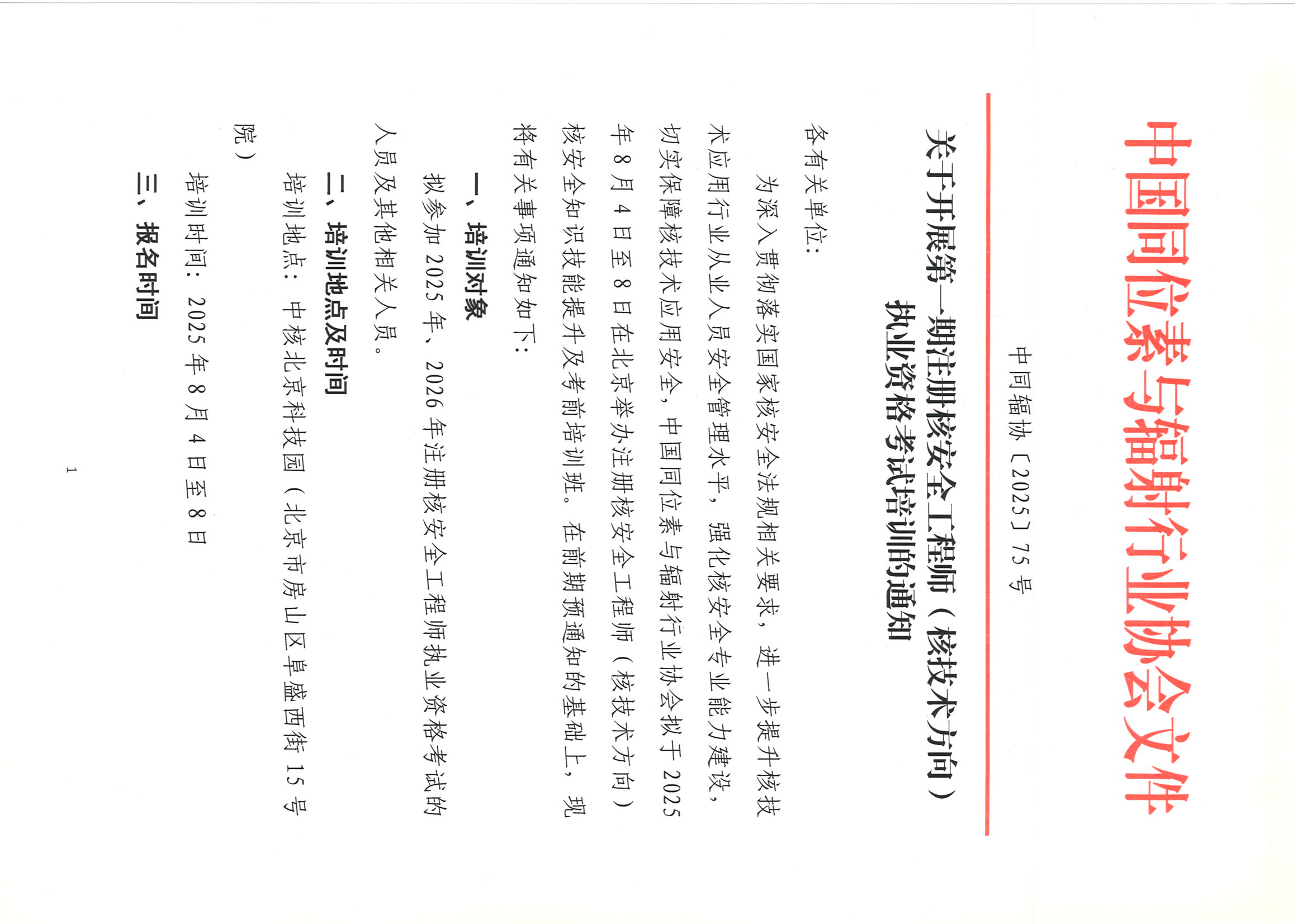 通知电子版下载:关于开展第一期注册核安全工程师(核技术方向)执业资格考试培训的通知.PDF