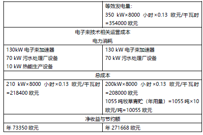 表6.初步经济分析(价格以2019年欧元计):对比仅采用电子束技术进行污泥卫生处理,与采用电子束技术同时进行沼气热电联产及污泥卫生处理的方案(仅考虑运营成本,不计投资成本)((Chmielewski et al., 2021a,b).