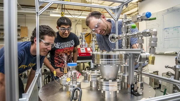 塞缪尔?科恩,盖尔?弗洛雷斯,丹?德怀尔在劳伦斯?伯克利国家实验室研究氩立方体技术。Marilyn Chung, LBNL